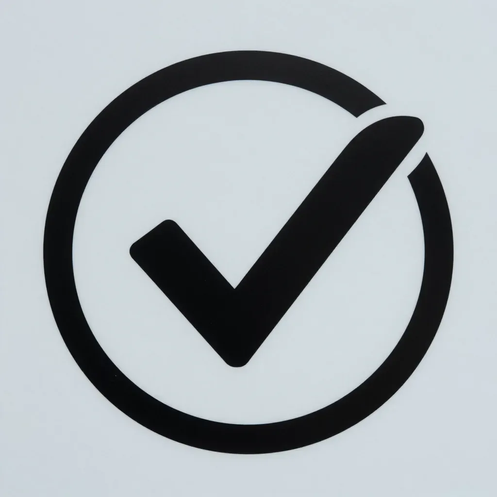 A glossy black checkmark symbol centered within a circle, illuminated by soft, diffused light that creates gentle shadows, set against a pure white background for high contrast and clean design.