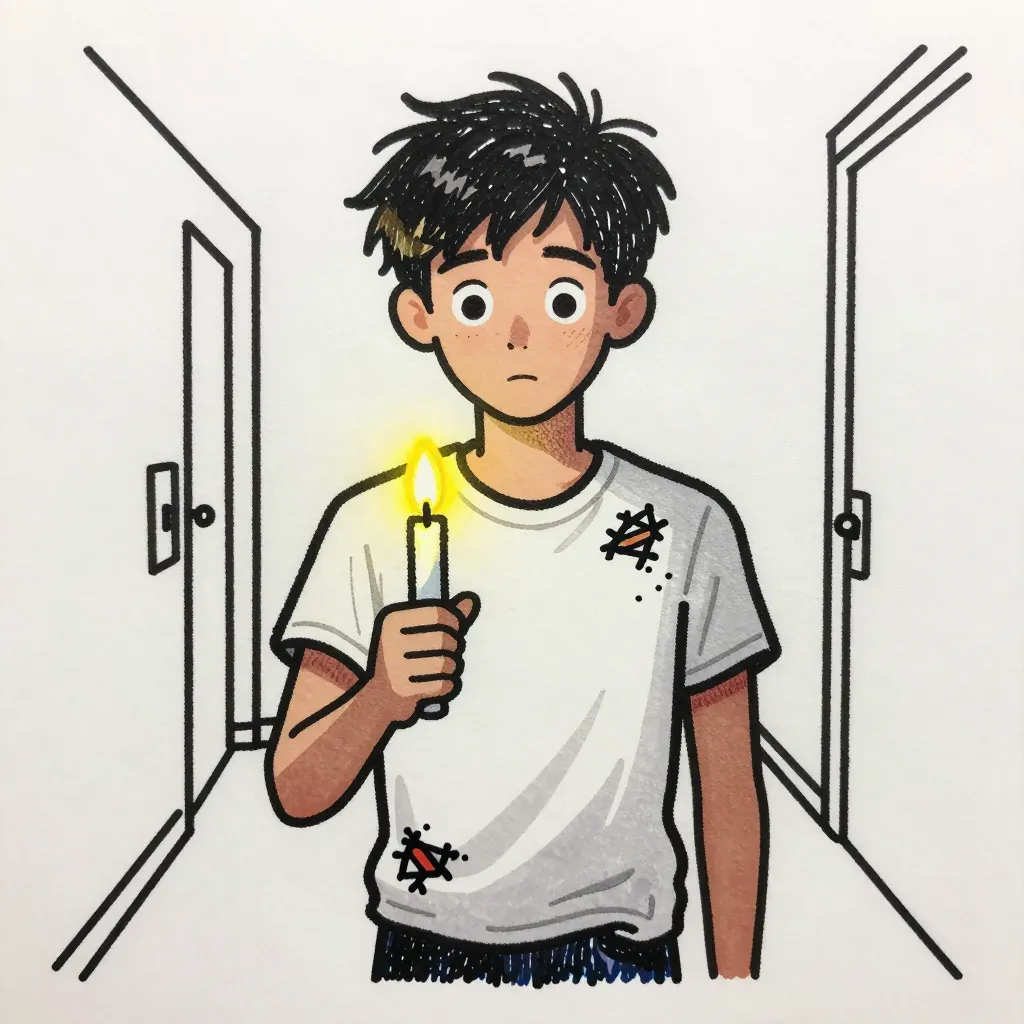 A young man with tousled hair holds a flickering candle, casting shadows and creating a sense of mystery in a dimly lit hallway. The rough walls and soft fabric of his t-shirt add texture to the scene, while the low ambient light enhances the eerie atmosphere.