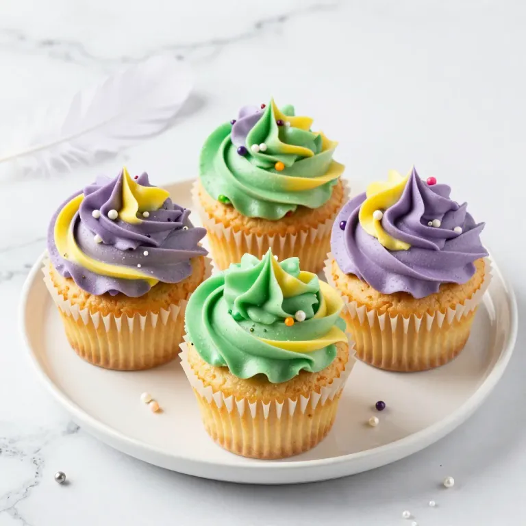 Four cupcakes with smooth, glossy purple and green frosting and colorful sprinkles are arranged in a centered close-up, highlighting their vibrant colors and glossy texture under soft, diffused lighting. The white marble background ensures the cupcakes are the focal point with minimal distractions.