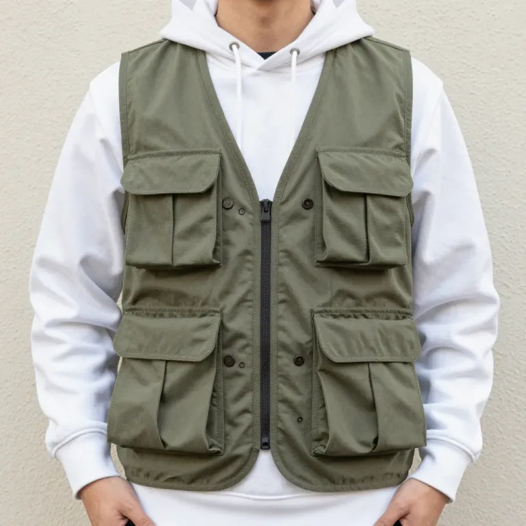 A model wears an olive utility vest with multiple pockets and a central zipper, set against a soft, even-lit, neutral beige wall. The gentle shadows highlight the vest's structure and texture, creating a clean and focused composition.