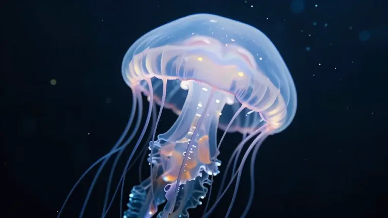 A translucent jellyfish with glowing tentacles gently glows against a dark, starry background, creating a serene and ethereal atmosphere. The soft, ambient light highlights the jellyfish's delicate form and vibrant colors, making it a captivating subject for design and advertising purposes.