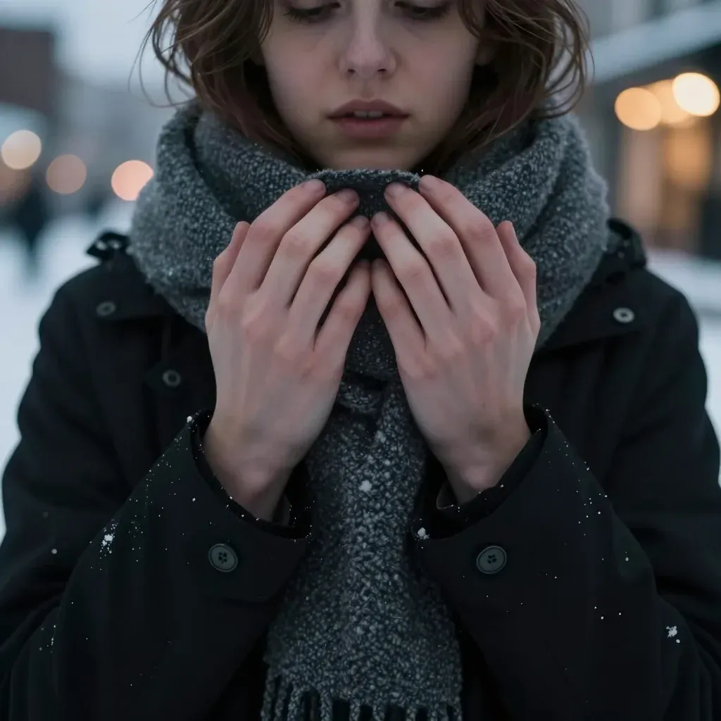 A person in a gray scarf and dark coat huddles their hands together, creating a sense of warmth and protection against the cold. The soft, diffused light and shallow depth of field highlight the texture of the scarf and coat, while the blurred cityscape in the background suggests a quiet, urban setting.