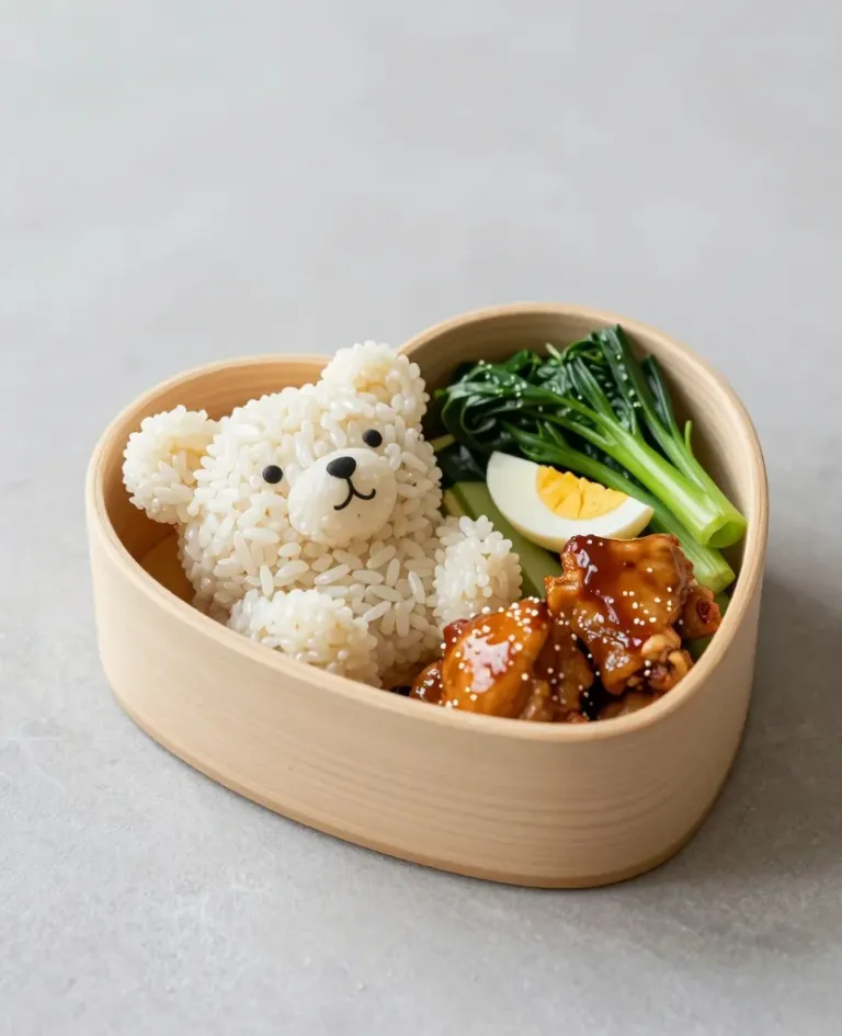 A heart-shaped bento box featuring a rice teddy bear, chicken with glossy sauce, fresh bok choy, and creamy egg, all arranged neatly under soft, diffused lighting that highlights the glossy textures and vibrant colors. The neutral gray background slightly blurs to emphasize the bento box, providing ample copy space.
