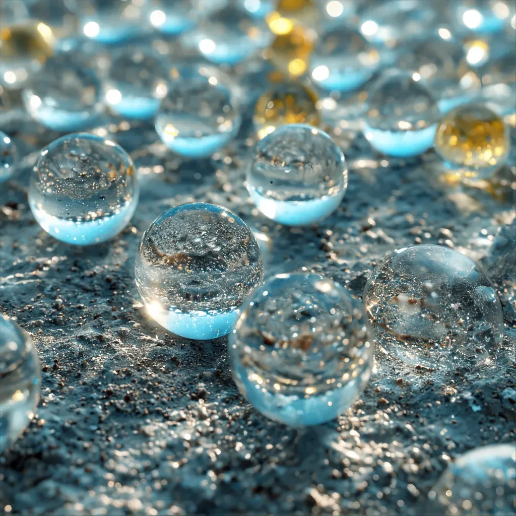 Vibrant blue and clear crystal spheres scattered on a rough, granular ground, illuminated by soft, diffused sunlight that creates highlights and reflections on the spheres. The shallow depth of field enhances the focus on the spheres, making them the central subject of the image.