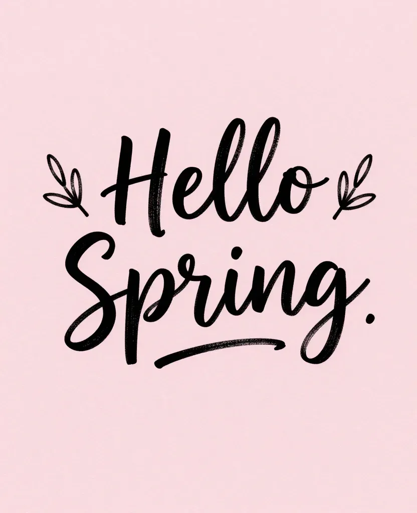 Hand-painted 'Hello Spring' lettering with soft pink background and white leaf illustrations, illuminated by diffused, even light. The clean, uncluttered design with symmetrical leaf illustrations on either side of the text provides ample copy space for various design applications.