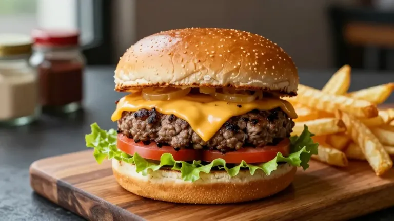 A juicy beef patty topped with stretchy melted cheddar, crisp lettuce, and firm tomato, nestled in a toasted sesame seed bun, served with golden ridged fries. Soft directional lighting from the upper left highlights textures with shallow depth of field and blurred kitchen background enhancing subject focus.