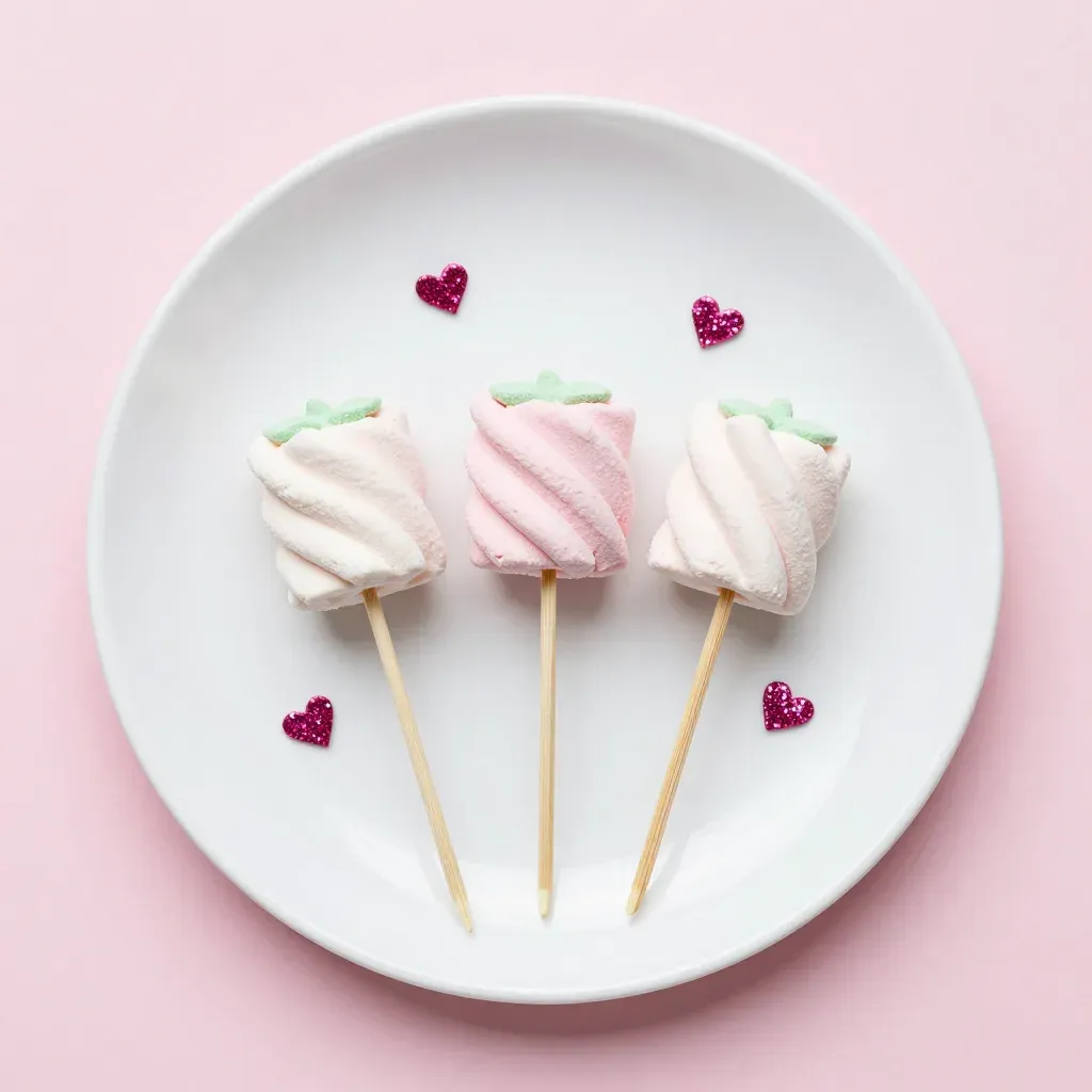 Soft, glossy marshmallows on wooden skewers arranged on a white plate, illuminated by diffused, soft light creating gentle highlights and shadows. The clean, solid pink background enhances the pastel colors and shallow depth of field.