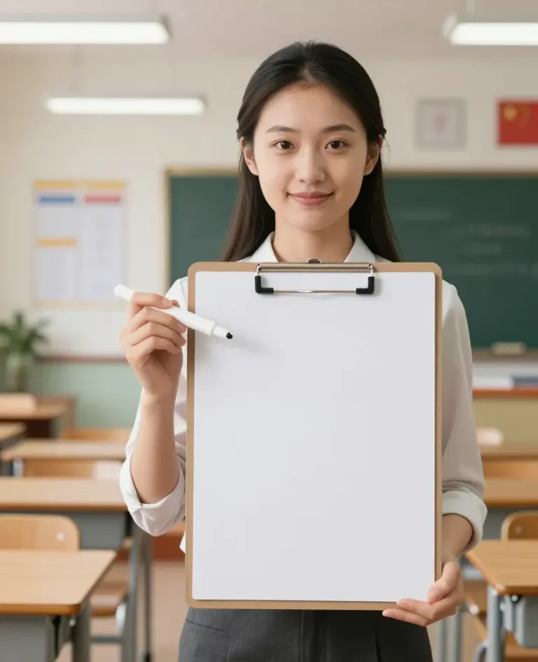 A young woman holds a marker and clipboard in a classroom setting, illuminated by soft, even light that creates gentle shadows. The composition is centered, drawing the viewer's eye forward, with a slightly blurred background that emphasizes the subject.