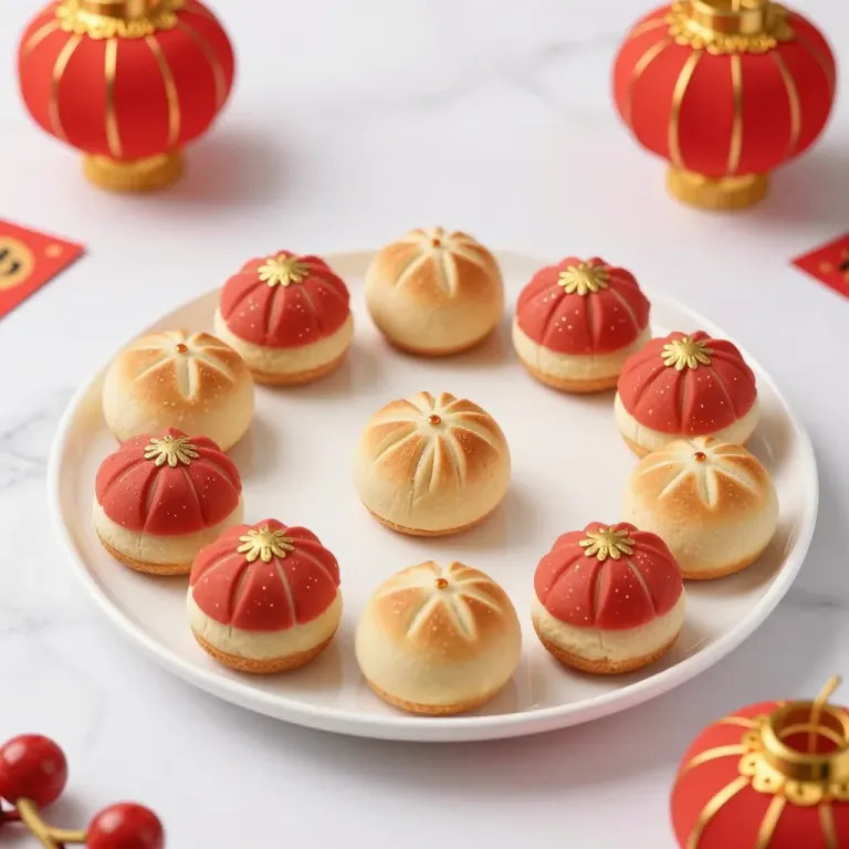 A plate of golden-brown pastries with glossy red tops and delicate gold star decorations, arranged in a visually appealing manner on a white marble surface, with warm ambient lighting enhancing the textures and colors, and red lanterns and small red and gold accents in the background adding to the festive atmosphere.