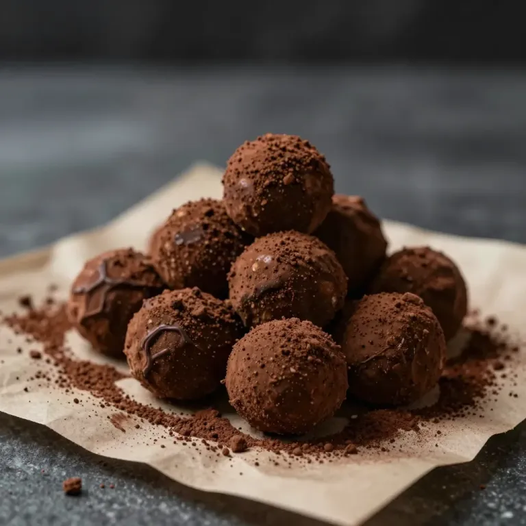 Smooth, glossy chocolate truffles are piled with cocoa powder, highlighting their rich, dark hues and soft texture. The soft, diffused lighting accentuates the truffles' smoothness and creates a warm, inviting atmosphere.