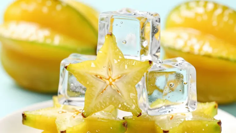 A starfruit slice glistens on ice cubes, illuminated by bright, diffused light that enhances its vibrant yellow hue and the clarity of the ice. The softly blurred background adds depth, focusing attention on the refreshing composition.