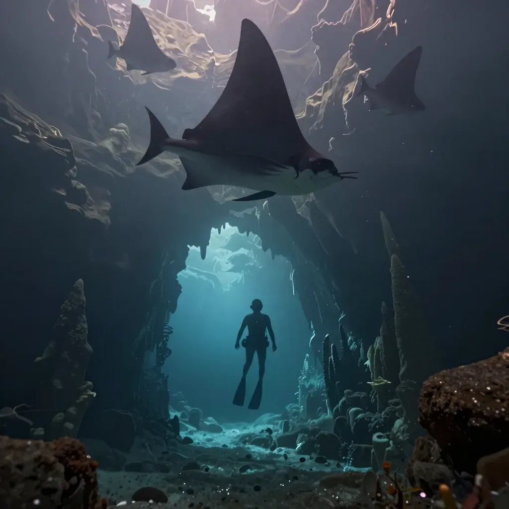 A diver stands in silhouette at the entrance of a deep underwater cavern, framed by towering rock spires, while a manta ray glides overhead in the dimly lit blue water. The scene is backlit by a distant opening, creating high contrast and layered depth with foreground rocks and mid-ground marine life.