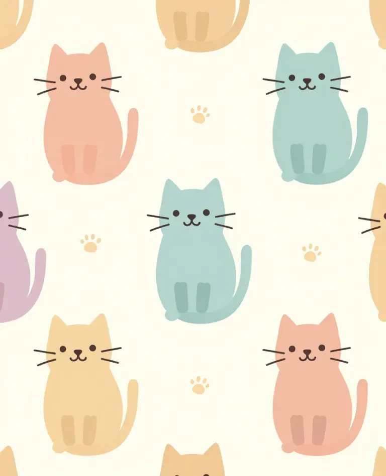 Seated cats in soft pastel shades of pink, teal, mustard, and lavender are scattered across a creamy off-white backdrop, rendered in a flat, plush-like digital illustration style. Diffuse, even lighting and balanced spacing create a seamless, repeating pattern ideal for surface design with ample negative space.