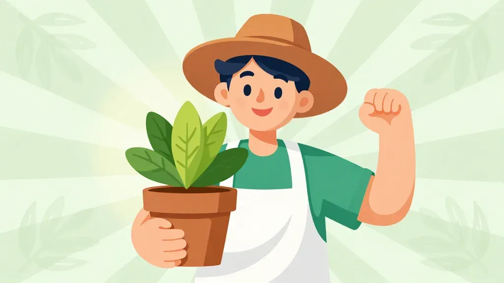 A botanist, wearing a wide-brimmed hat and green apron, holds a small plant with delicate, glossy leaves, bathed in warm, golden sunlight. The soft shadows and highlights emphasize the subject, while the blurred background of lush green foliage creates depth and focus on the botanist.