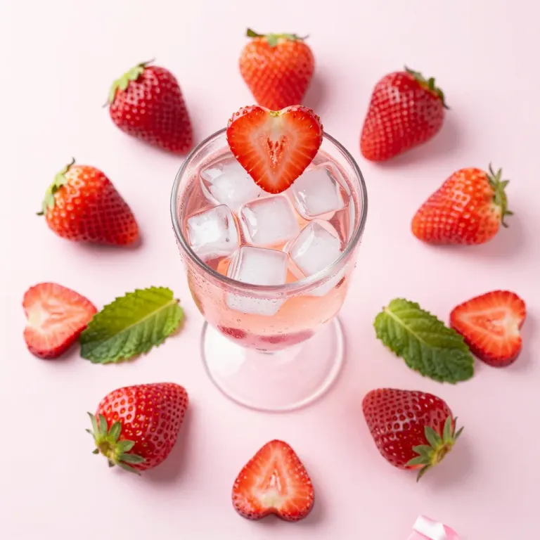 A glass of strawberry mocktail garnished with a heart-shaped strawberry slice, set against a soft, diffused light that enhances the vibrant colors and textures, with a clean, light pink background that keeps the focus on the subject.