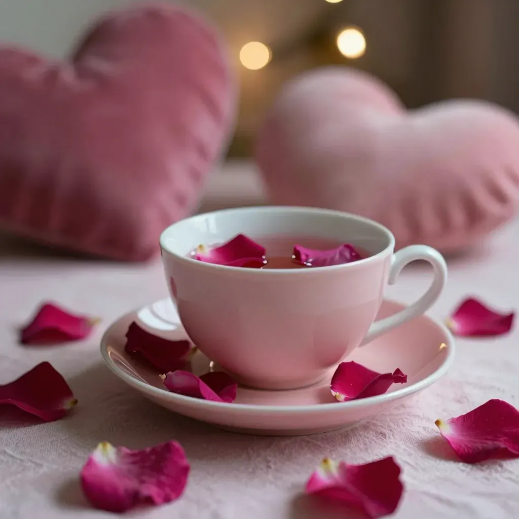 A close-up of a glossy pink teacup and saucer adorned with rose petals, set against a soft, warm, golden light with blurred heart-shaped cushions in the background. The shallow depth of field highlights the delicate textures and colors, creating a serene and intimate atmosphere.