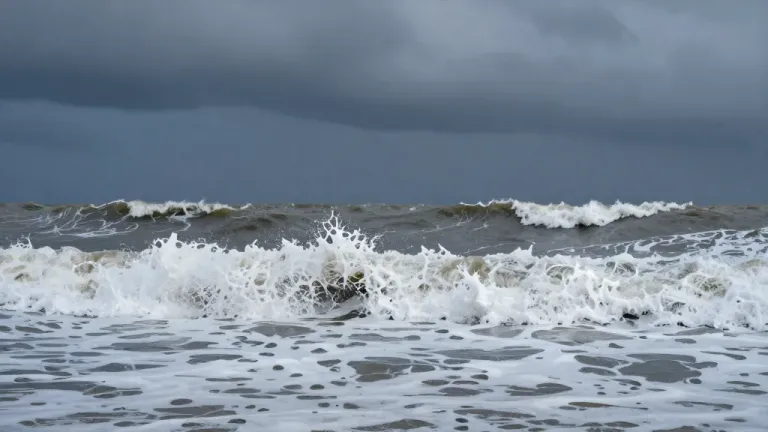 Dynamic waves crash with frothy white foam, illuminated by diffused light from an overcast sky, creating a dramatic and textured seascape. The dark, brooding clouds in the background enhance the sense of impending storm and add depth to the composition.