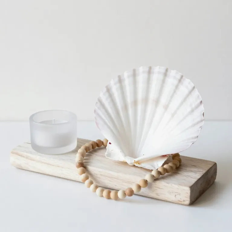 A serene still life featuring a scallop shell, frosted glass candle holder, and wooden beads, arranged on a wooden tray under soft, natural light. The clean white background emphasizes the textures and colors of the objects, creating a harmonious and calming composition.