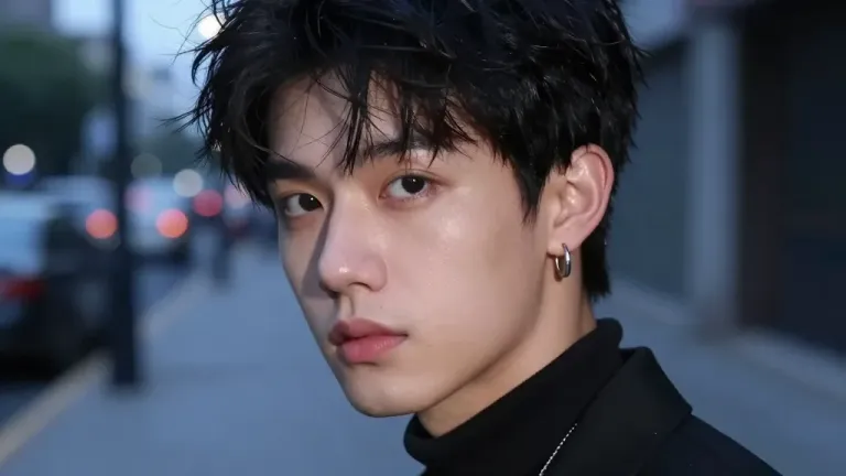A person with tousled hair and a small hoop earring is captured in a close-up shot, illuminated by soft, diffused light that highlights their glossy hair and smooth skin. The blurred street scene in the background, with bokeh lights, adds depth and context to the urban setting.