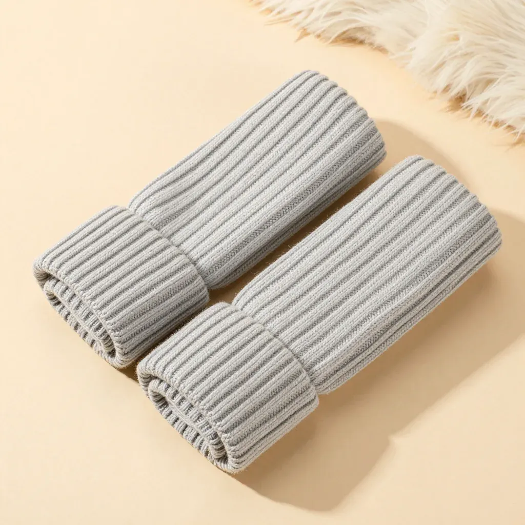 Neatly folded knitted leg warmers with visible ridges in light gray, softly lit with diffused light casting gentle shadows. Minimalistic background with copy space, ideal for product display.