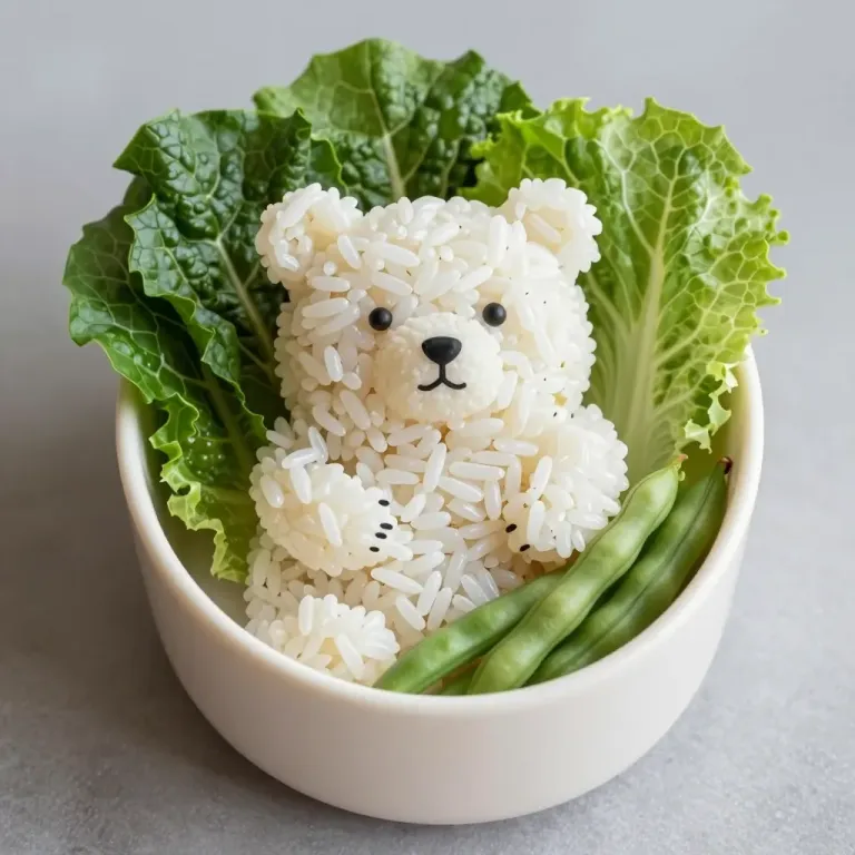 A soft, fluffy bear-shaped rice ball rests atop crisp green cabbage leaves, bathed in soft, diffused light that enhances its three-dimensional quality. The shallow depth of field and neutral gray background ensure the subject remains the focal point.