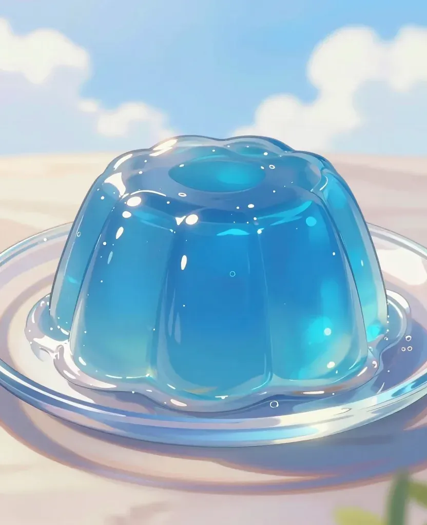 A glossy, translucent blue jelly dessert sits on a clear glass plate, reflecting soft, diffused sunlight, creating a serene and inviting scene. The blurred beach background with golden tones adds depth and context to the composition.