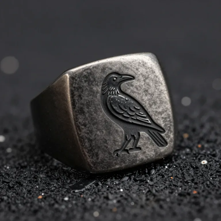 A close-up of a gunmetal ring featuring an engraved raven, set against a dark, textured background with directional lighting casting sharp shadows. The shallow depth of field draws attention to the intricate details of the ring and the engraved bird.