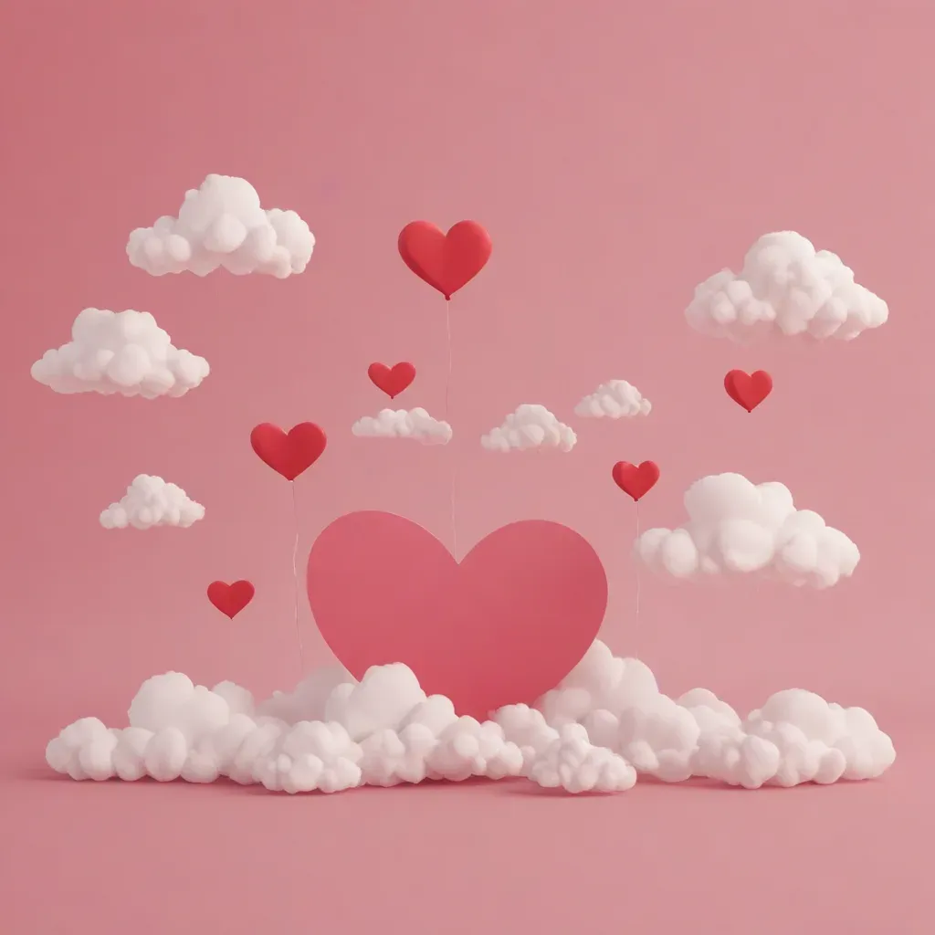 A large pink heart floats among smaller red hearts, surrounded by fluffy white clouds against a soft pink background. Subtle diffused lighting highlights the glossy surfaces of the hearts and casts gentle shadows on the clouds, creating a serene and romantic atmosphere.