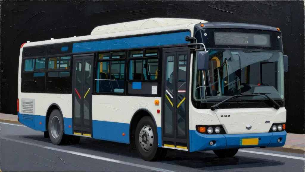 A sleek, modern bus with a glossy blue and white finish glides through a neon-lit urban environment. The diffused lighting highlights the bus's smooth surfaces and creates a striking contrast against the dark background, emphasizing its futuristic design.