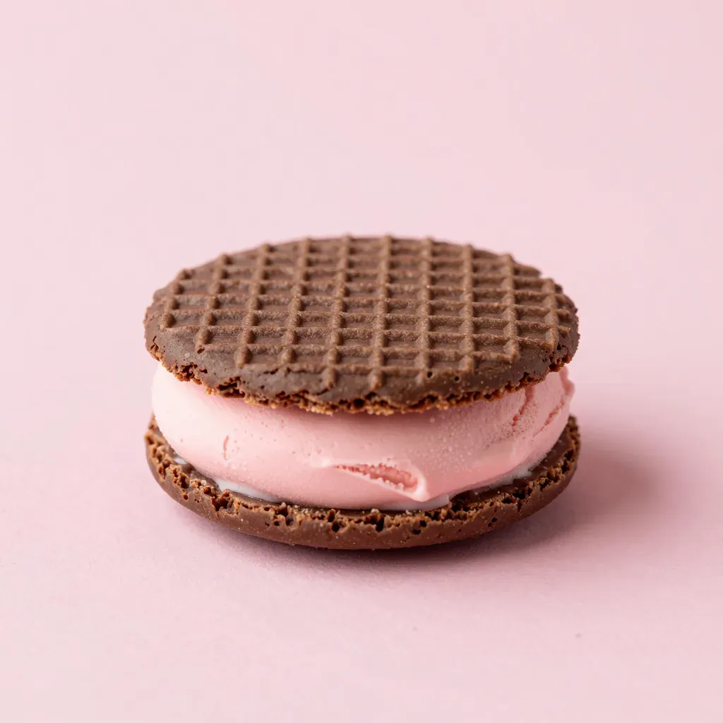 A close-up of a chocolate wafer treat with a soft pink filling, highlighted by diffused lighting that accentuates the glossy chocolate coating and creamy texture. The blurred pink background ensures the treat is the focal point, offering ample copy space for design integration.