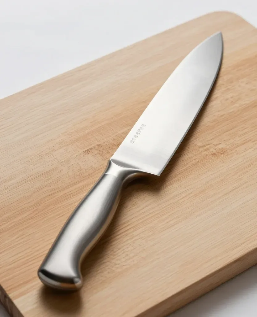 A polished chef's knife with a silver handle rests on a wooden cutting board, illuminated by soft, diffused light that highlights the blade and handle, creating gentle shadows on the wood. The shallow depth of field focuses on the knife, emphasizing its sleek design against a plain white background.
