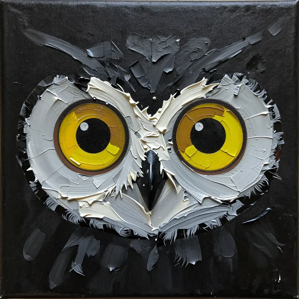 A close-up of an owl's face with large, expressive eyes and a sharp beak, rendered with thick, layered paint strokes that give a rough, tactile feel to the feathers. The high contrast lighting and dark background emphasize the subject, creating a sense of depth and isolation.