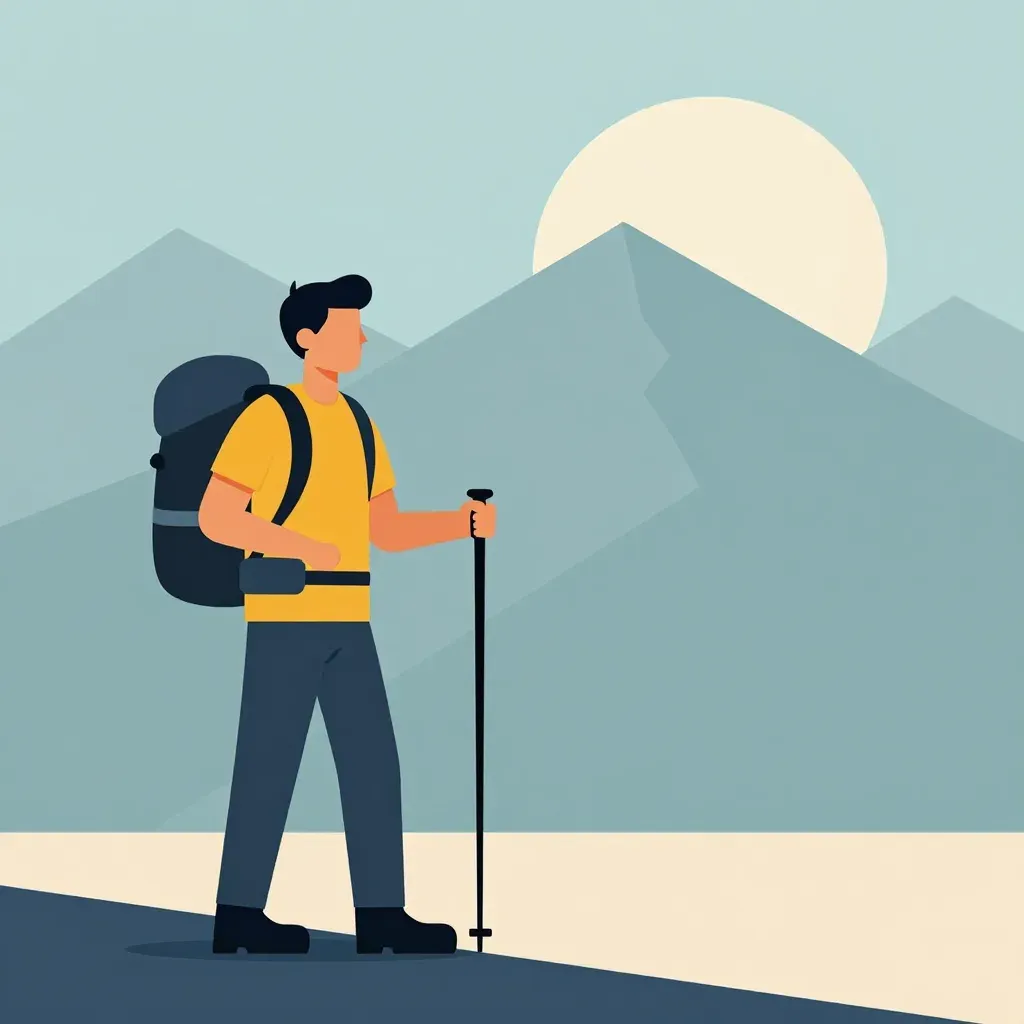 A hiker pauses on a cliffside, gazing at the distant mountains bathed in warm, golden sunlight. The composition is balanced, with the subject centrally framed against a serene, softly focused backdrop.