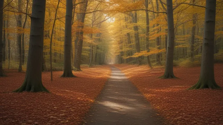 A serene forest path lined with golden leaves and tall trees bathed in soft, diffused sunlight. The symmetrical composition and shallow depth of field create a tranquil, inviting scene ideal for nature and travel imagery.