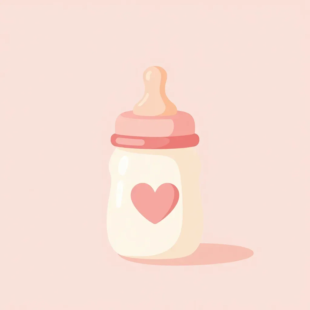 A smooth, glossy baby bottle with a heart design, softly lit and centered against a pale pink, blurred background. The composition offers ample copy space for design integration.