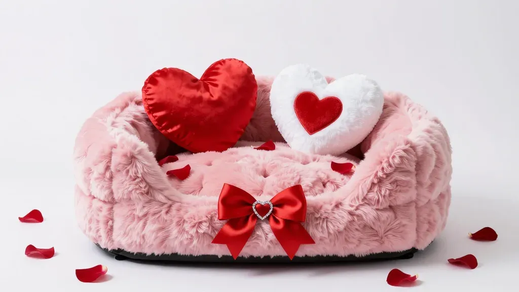 A cozy plush pink pet bed adorned with glossy red heart-shaped pillows and a decorative bow, set against a clean white background with soft, diffused lighting that highlights the texture and color of the bed and pillows. The composition is centered, with rose petals adding depth and context, making it ideal for product photography and promotional materials.