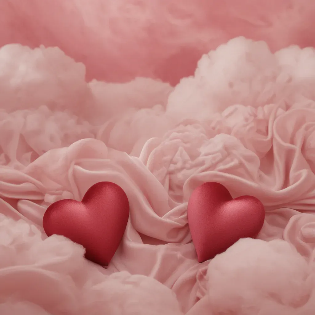 Two glossy red hearts rest on a soft, velvety pink fabric, illuminated by diffused, soft pink light. The ruffled fabric creates a sense of depth and texture, making the image ideal for romantic and Valentine's Day themes.