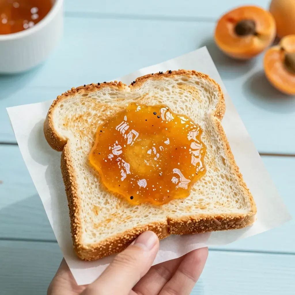 A close-up of toasted bread spread with glossy apricot jam, illuminated by soft natural light, creating highlights on the jam and bread. The shallow depth of field focuses on the bread and jam, with a blurred background of apricots and a bowl of jam, providing context.
