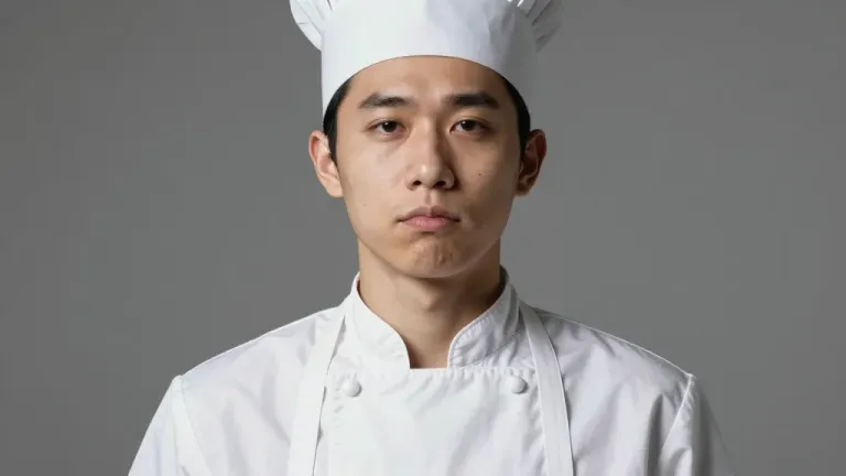 A chef in a pristine white uniform and hat stands upright, illuminated by soft, diffused light that creates gentle shadows and highlights, emphasizing the smooth texture of the fabric and glossy finish of the hat. The neutral gray background, blurred to emphasize the subject, offers ample copy space for various design applications.