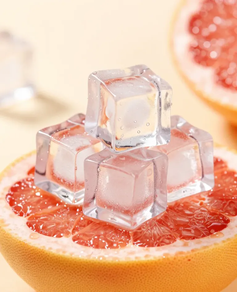 Ice cubes rest atop a juicy grapefruit slice, highlighting the contrast between the hard, clear ice and the soft, textured fruit. The soft, diffused lighting enhances the vibrant pink and orange hues, creating a fresh and natural aesthetic.