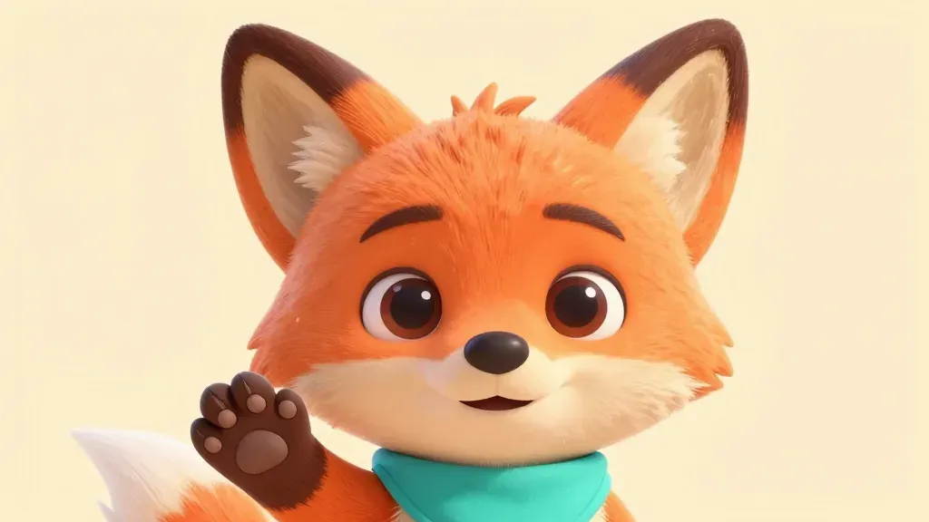 A close-up of a curious fox pup waving its paw, showcasing its soft, glossy fur and teal shirt against a cream-colored background. The diffused, ambient lighting highlights the texture and creates a gentle, inviting atmosphere.