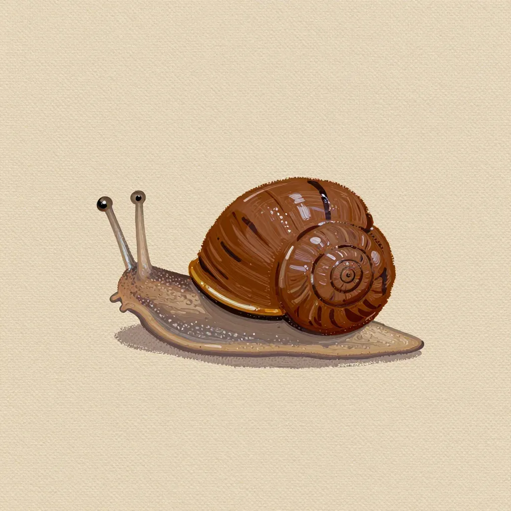 A glossy brown snail with translucent beige body slides across a textured beige surface, casting soft shadows. The top-down lighting highlights the shell's glossy texture and creates a serene, minimalist composition.