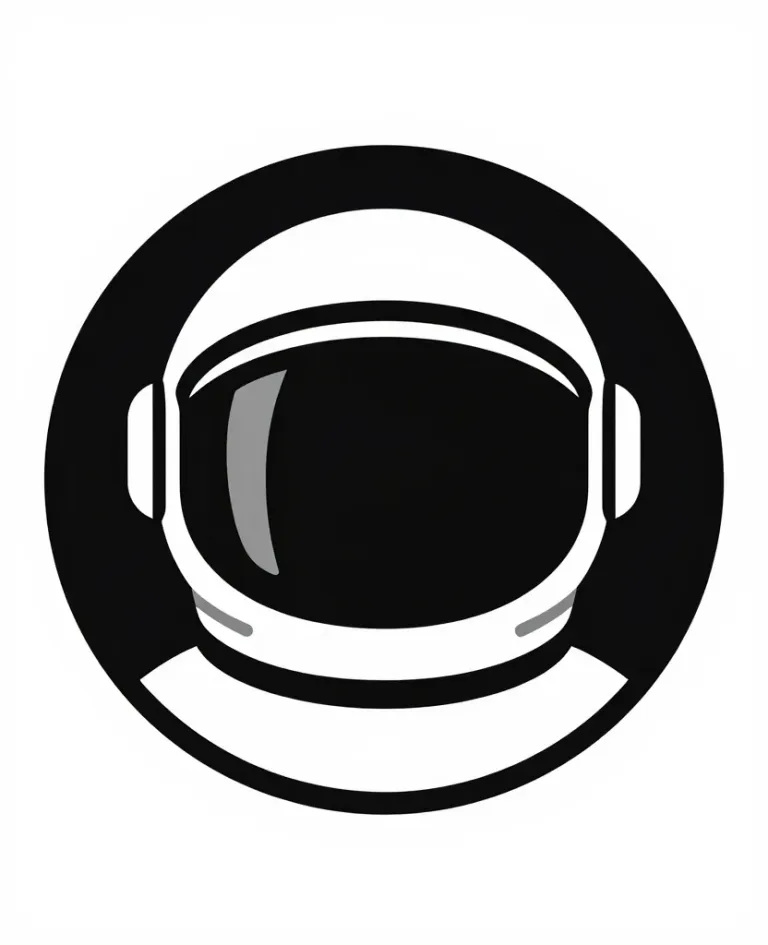 A glossy, reflective astronaut helmet icon centered within a circular frame, illuminated by frontal lighting that creates highlights and shadows on the visor. The minimalist design with a solid white background offers ample copy space for various applications.