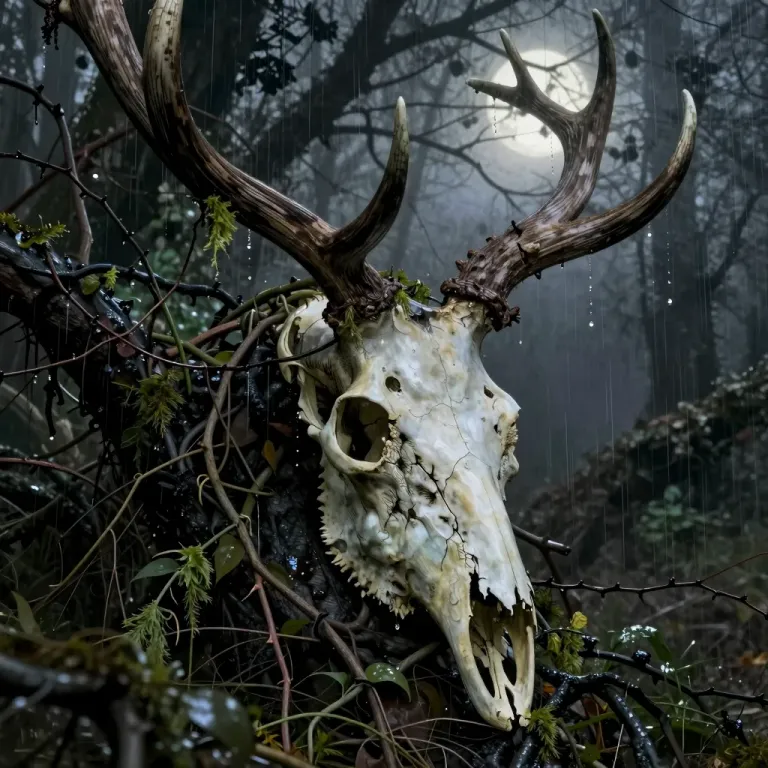 A weathered deer skull, covered in rough, gnarled wood and glossy moss, is framed by tangled branches in a dimly lit, ethereal forest. The soft, filtered light and shallow depth of field create a sense of mystery and depth, emphasizing the skull as the focal point.