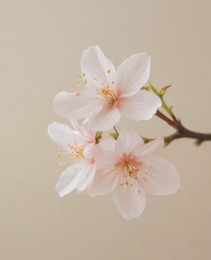 Delicate white cherry blossoms with subtle pink hues and fine stamens softly lit by diffused light, creating gentle highlights and shadows. The neutral beige background, out of focus, emphasizes the blossoms and provides ample copy space.