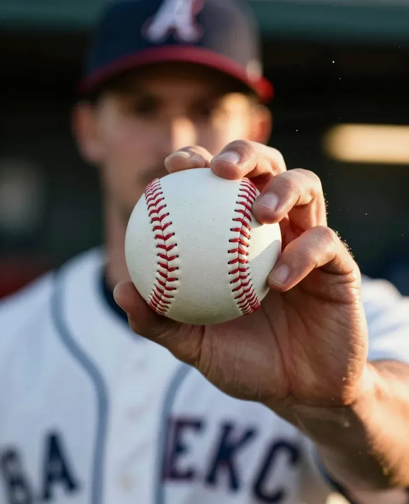 A close-up of a baseball gripped in a pitcher's hand, showcasing the smooth leather and raised red stitching under warm sunlight, with dry, calloused skin visible on the fingers. The shallow depth of field isolates the ball and hand against a softly blurred stadium background, emphasizing the moment of release preparation.