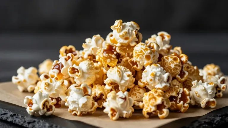 A centered heap of soft, fluffy popcorn kernels coated in glossy, sticky caramel, highlighted by diffused light that creates subtle shadows and enhances the golden hue. The dark, blurred background provides a stark contrast, focusing attention on the popcorn's texture and glossy caramel coating.