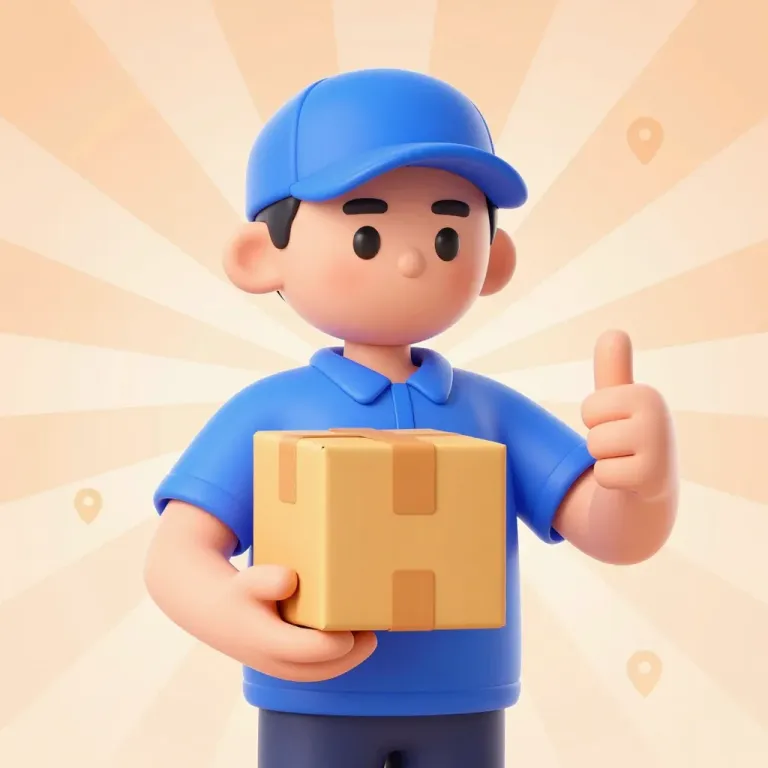 A delivery courier in a blue uniform confidently holds a cardboard box while giving a thumbs-up, illuminated by soft, warm light that creates a halo effect. The radiant burst background adds depth and a playful feel to the image.