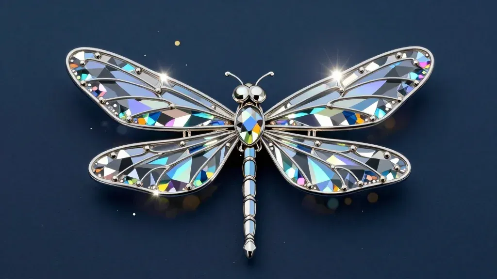 A crystal dragonfly brooch gleams under direct light, highlighting its intricate facets and vibrant blue, green, and yellow accents. The dark, smooth background ensures the brooch stands out, making it perfect for fashion and jewelry design inspiration.