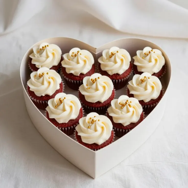 Delicate red velvet cupcakes with smooth white frosting and golden sprinkles are artfully arranged in a heart-shaped box, creating a symmetrical and elegant presentation. The soft, diffused lighting highlights the creamy texture of the frosting and the glossy finish of the golden sprinkles, while the blurred white fabric background ensures the focus remains on the cupcakes.